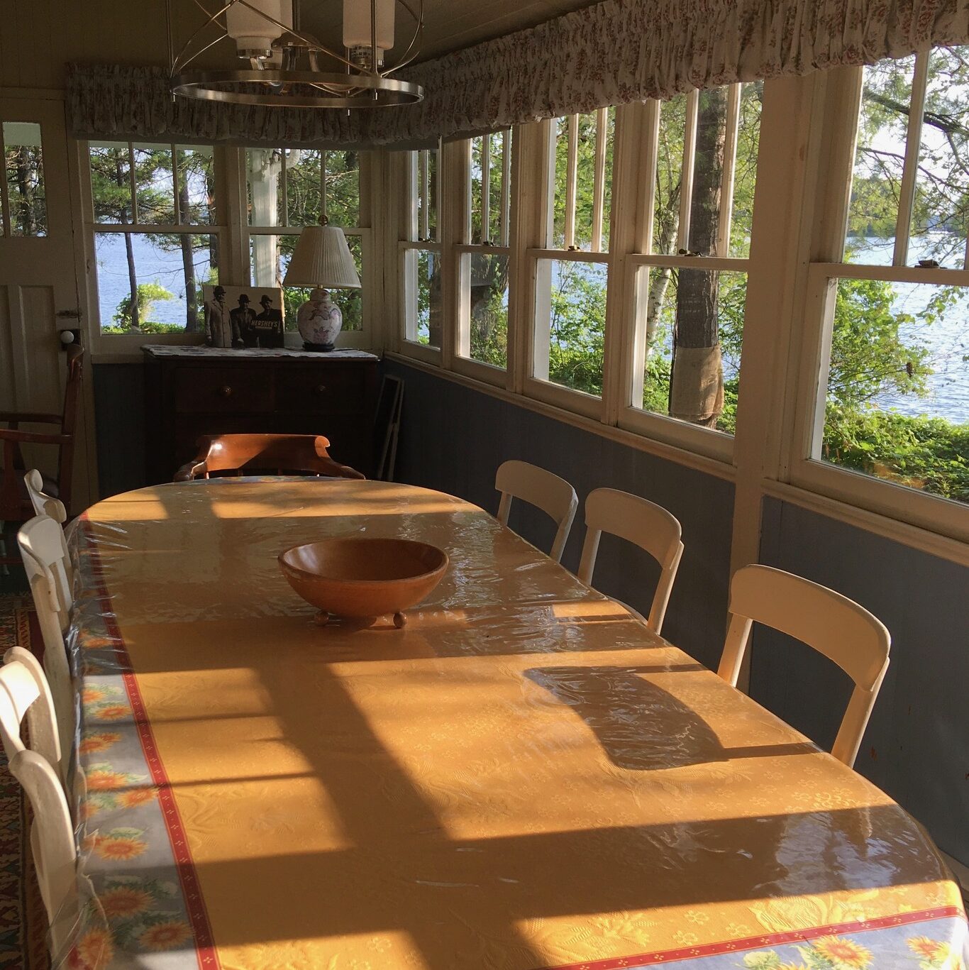 The dining room has a full length set of windows overlooking the lake with a perfect sunset view of water and islands. It features: